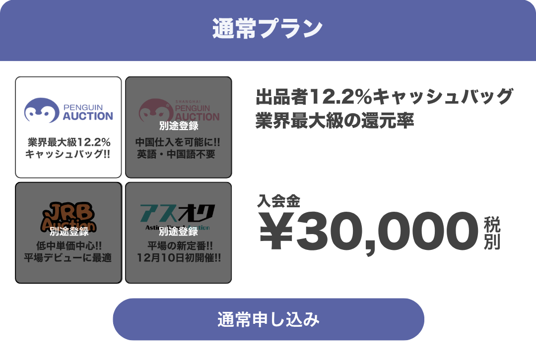 ペンギンオークションのみ利用可能な「通常プラン」と、4つのオークションが利用可能な「おまとめプラン」をご用意いたしました。