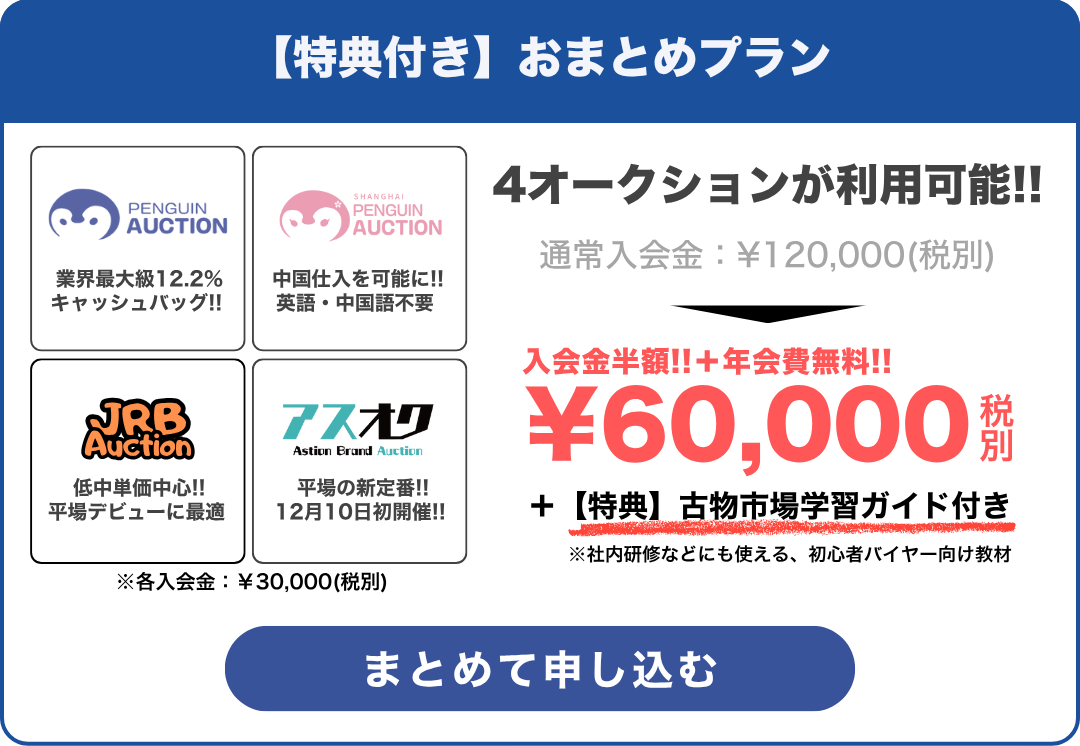 「おまとめプラン」は、期間限定で入会金が半額+初心者バイヤー向けの学習教材を特典としてプレゼントしております。